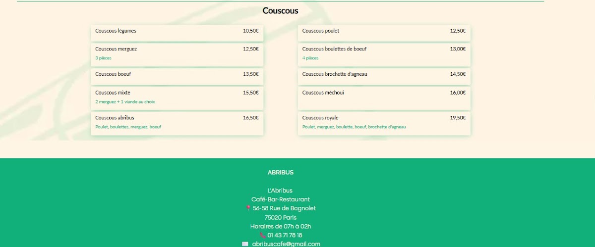 Welcome to L'Abribus, a hidden gem nestled in the heart of Paris at 56 Rue de Bagnolet. This charming establishment offers a delightful menu that celebrates the vibrant flavors of Algerian cuisine alongside classic French fare. Patrons rave about the star dish, the mouthwatering chicken couscous, complemented perfectly by golden raisins and zesty harissa. Don't miss the steak paired with truffle sauce and crisp fries that are described as "to die for." The atmosphere here is inviting, with friendly staff who ensure your dining experience is exceptional.